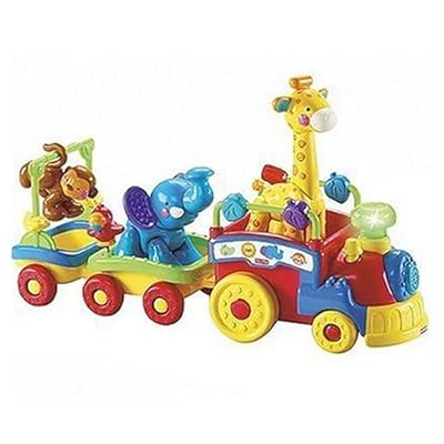 Toot! Toot! Here come the animals, riding around on a musical choo-choo train. This fun motorized train helps babies ages six months to three years learn about animals through song and play.